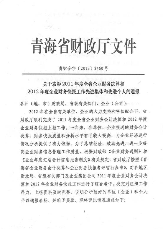 2012年,在集團及所屬各公司領導的高度重視下,在所屬各公司的大力支持和密切配合下,在辛勤工作在財務會計崗位上的同事們的共同努力下,集團總公司圓滿完成了省國資委和省財政廳各類報表的上報工作,財務信息工作質(zhì)量、時效性和財務分析水平都比上一年度有所提高,受到了省國資委和省財政廳的好評,集團總公司2011年度財務決算工作被省國資委評為先進單位,集團財務審計部張莉青同志被省財政廳評為2012年度財務快報工作先進個人。